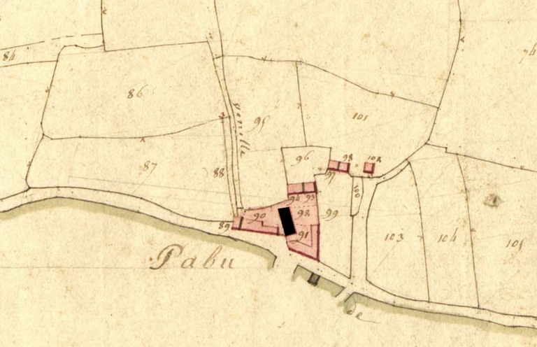 Extrait de la feuille C1 du cadastre ancien de la commune de Trégrom, 1834 : le manoir de Pabu (en noir)Immatriculation