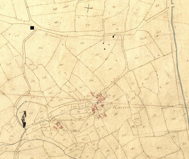 Extrait de la feuille C2 du cadastre ancien de la commune de Trégrom, 1834 : croix de Kerarvoën (emplacement approximatif en noir)Immatriculation