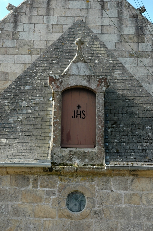 Vue de détail des ouvertures du pignon est : oculus et lucarne ouvragée à fronton triangulaire (inscription "IHS" surmontée d'une croix)Immatriculation