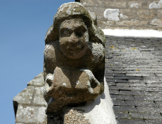 Vue du clocher-mur occidental : détail d'une crossette sculptée (remploi)Immatriculation