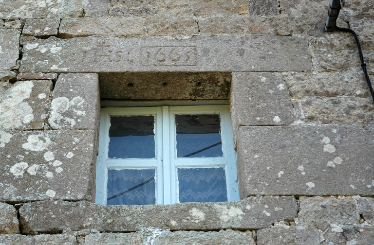 Vue de l'élévation antérieure orientée vers l'est : détail du linteau de fenêtre daté "1665" et portant un monogramme du ChristImmatriculation