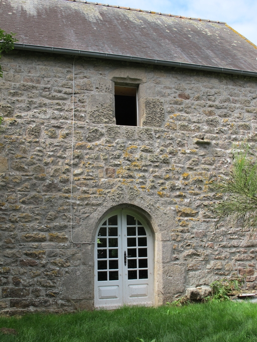 Vue de la façade postérieure orientée vers l'est-sud-est : porte en arc plein cintre et petite baie à linteau en accoladeImmatriculation