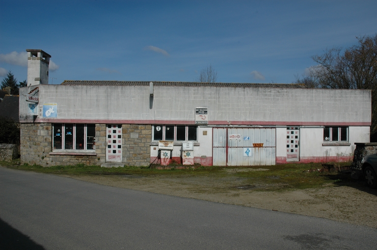 Trégrom, le bourg : ancien garage et station de carburant. La partie en pierre comporte une pierre de remploi datée 1849Immatriculation