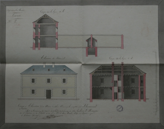 Coupe et élévation d'une maison de police municipale à l'angle de la rue Poulpatré et de l'actuelle rue Anne de Mesmeur, 1813 (A.D. Finistère, série 2 0)Immatriculation
