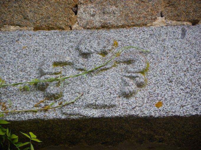 Détail du linteau sculpté portant des armoiries.Immatriculation