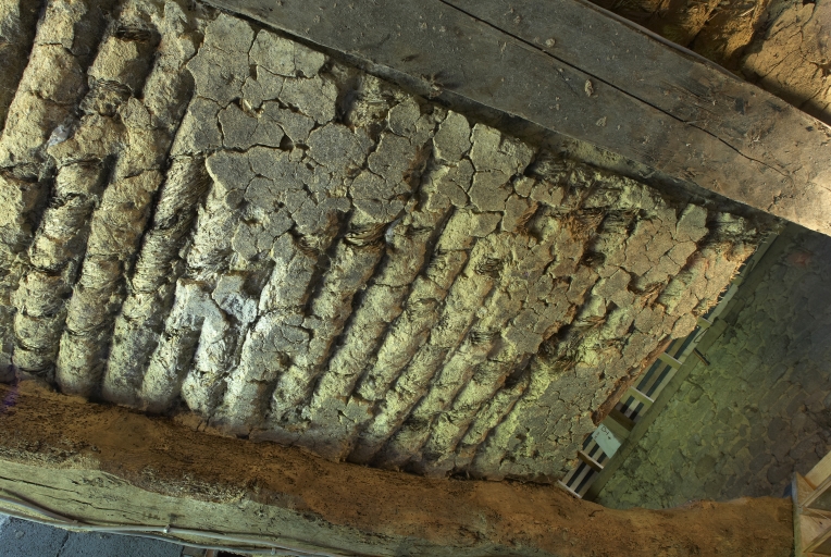 Premier logis, plafond, détail des poutres et barasseauxImmatriculation