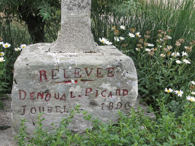 À l'est de Trévéré, sur la D 174, croix monumentale 2, inscription sur le socle : RELEVEE / DENOUAL . PICARD / JOUBEL 1896 (état en 2010)Immatriculation