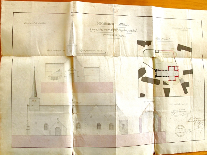 Etat des édifices religieux de la place du bourg ; plan de situation, élévation sud et ouest de l 'église par Amé, architecte du département, 1861. (AD Morbihan 2O 93)Immatriculation