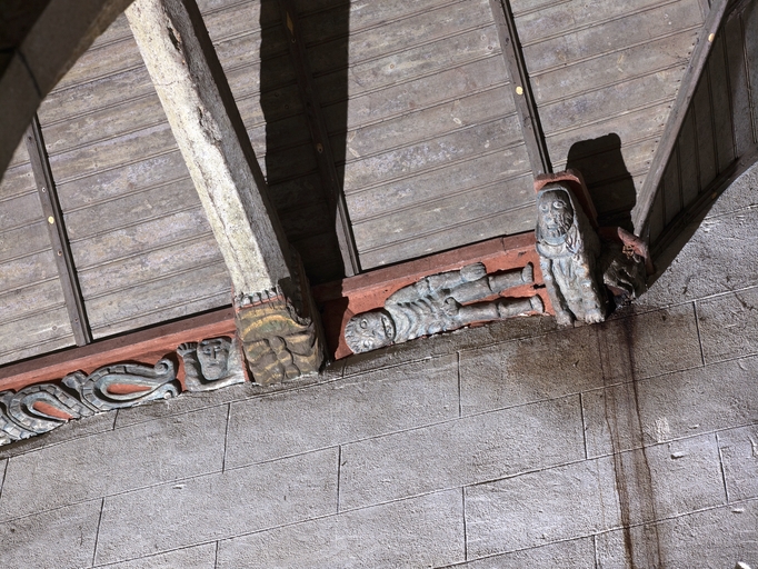 Loguivy-Plougras, le bourg : vue intérieure de l'église paroissiale Saint-Emilion, bas-côté nord, sablière sculptéeImmatriculation