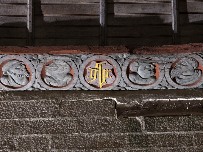 Loguivy-Plougras, le bourg : vue intérieure de l'église paroissiale Saint-Emilion, nef, sablière sculptéeImmatriculation