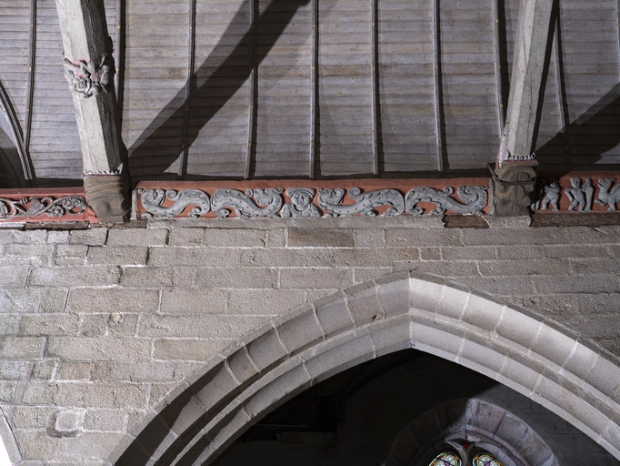 Loguivy-Plougras, le bourg : vue intérieure de l'église paroissiale Saint-Emilion, nef, sablière sculptéeImmatriculation