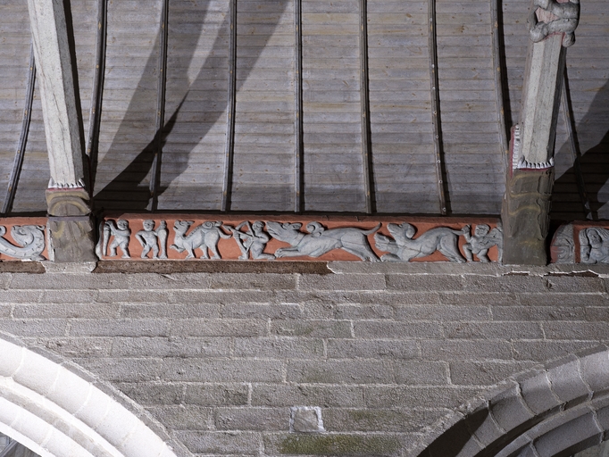 Loguivy-Plougras, le bourg : vue intérieure de l'église paroissiale Saint-Emilion, nef, sablière sculptéeImmatriculation