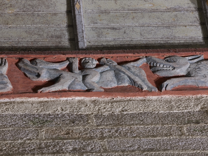 Loguivy-Plougras, le bourg : vue intérieure de l'église paroissiale Saint-Emilion, nef, sablière sculptéeImmatriculation