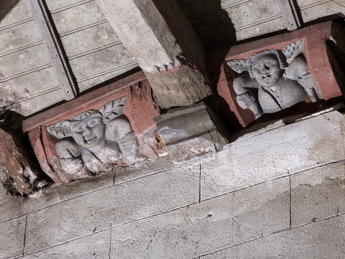 Loguivy-Plougras, le bourg : vue intérieure de l'église paroissiale Saint-Emilion, nef, sablière sculptéeImmatriculation