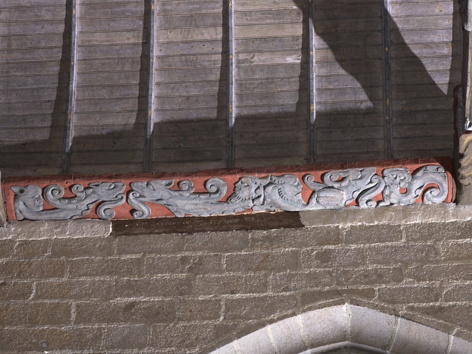 Loguivy-Plougras, le bourg : vue intérieure de l'église paroissiale Saint-Emilion, nef, sablière sculptéeImmatriculation
