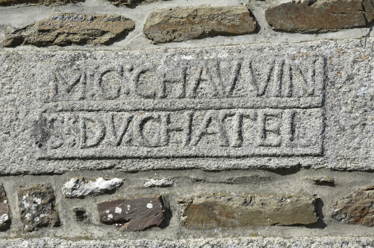 Détail, inscription au-dessus de l'entrée : M:G:CHAUVIN/S:DU.CHATELImmatriculation