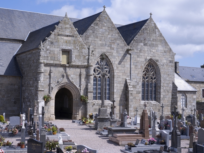 Pluzunet, le bourg, place Marc'harit Fulup : église paroissiale Saint-Pierre, vue sud, porche et transeptsImmatriculation