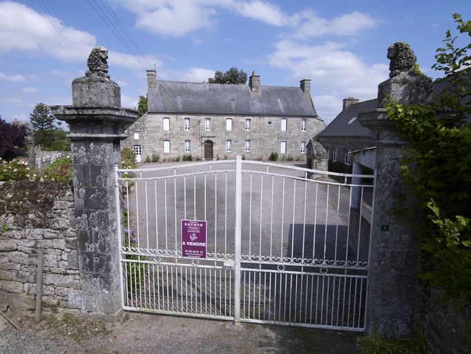 Vue générale de l'entrée de la ferme : portail encadré de deux piliers de graniteImmatriculation