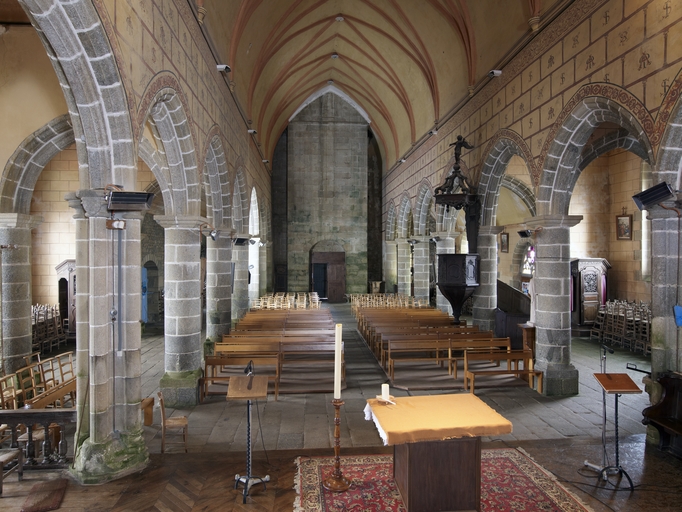 Pluzunet, le bourg, place Marc'harit Fulup : église paroissiale Saint-Pierre, vue intérieure, vers la nefImmatriculation