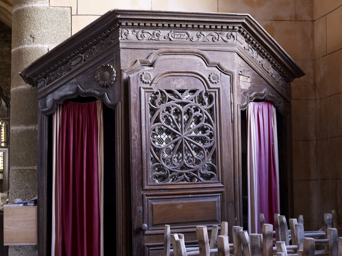 Pluzunet, le bourg, place Marc'harit Fulup : église paroissiale Saint-Pierre, vue intérieure, confessionnal nordImmatriculation