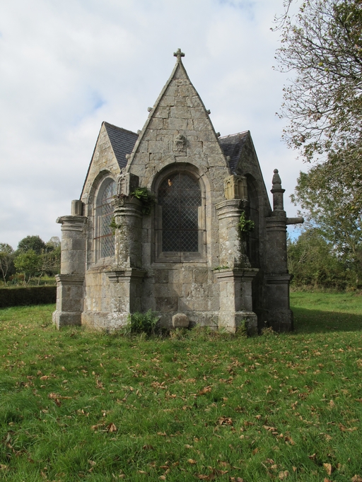Le Vieux-Marché, La Trinité : chapelle, vue est, chevet à noues multiples avec contreforts circulaires à socle carré, ornés de pinacles, et canonnière formant gargouilleImmatriculation