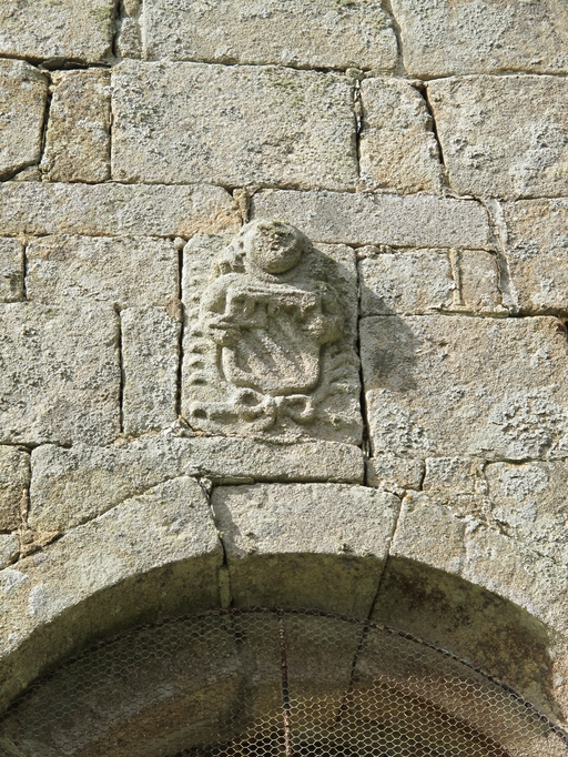 Le Vieux-Marché, La Trinité : chapelle, vue est, chevet à noues multiples, détail du décor, armes des seigneurs de La Haye de GuernahamImmatriculation