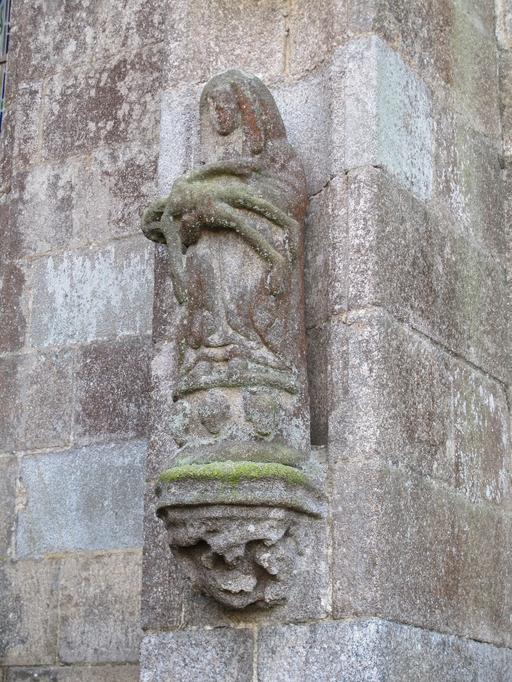 Le Vieux-Marché, le bourg, place Angela Duval : église paroissiale Notre-Dame-de-Consolation, élévation nord, détail de la Pietà située dans une niche (la Vierge Marie pleurant son enfant qu'elle tient sur ses genoux)Immatriculation