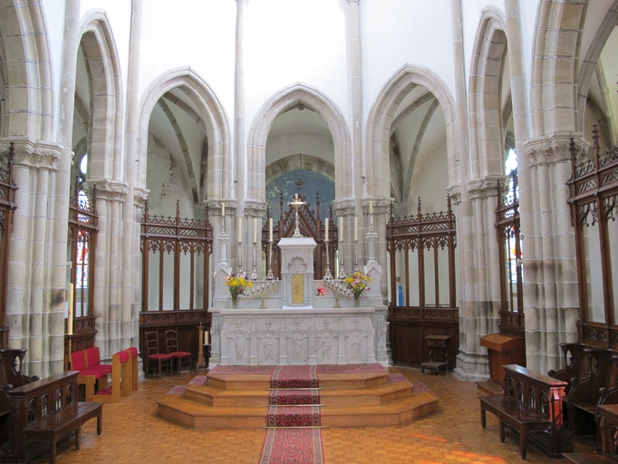 Le Vieux-Marché, le bourg, place Angela Duval : église paroissiale Notre-Dame-de-Consolation, vue intérieure, maître-autel en pierre avec des figures de saintsImmatriculation