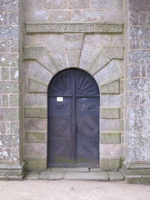 Le Vieux-Marché, les Sept Saints : chapelle, porte ouest en plein cintre à bossage. Inscription : LE 22 IUILLET 1703Immatriculation