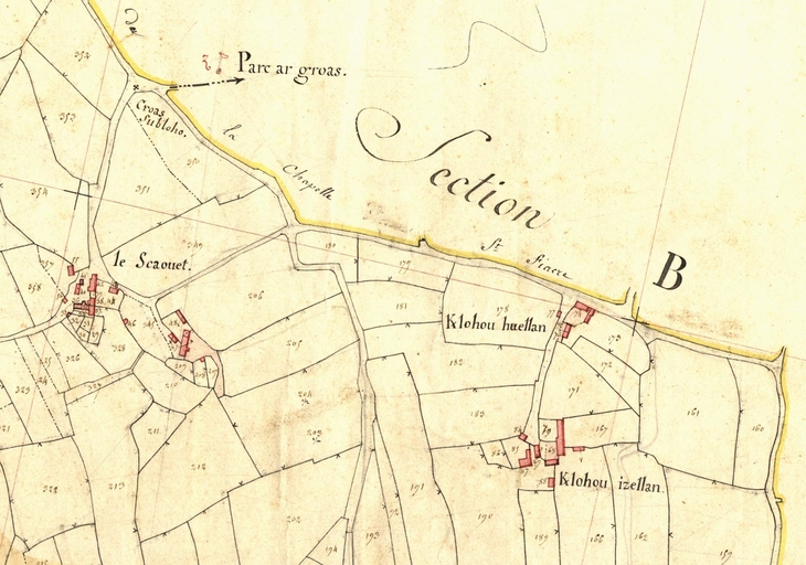 Extrait de la feuille D1 du cadastre ancien de la commune de Le Vieux-Marché, 1835 : Kerlohou [Croas Subloho ; le Scaouet ; Kerlohou huellan ; Kerlohou izellan]Immatriculation