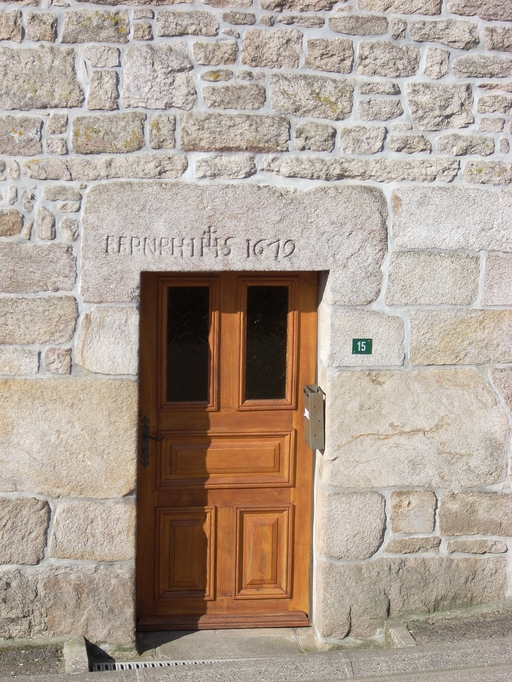 Plounérin, le bourg, 15 rue de l'Eglise : maison, façade est sur rue, détail de la porte. Inscription : F.F.P.NPHIHS 1619Immatriculation