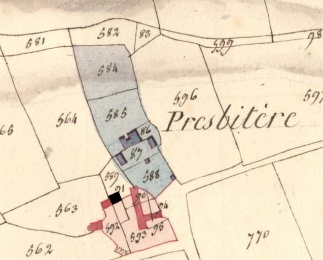 Extrait du cadastre ancien de la commune de Lanvellec, 1813 : le presbytère [Prebitère]. En noir : maisonImmatriculation
