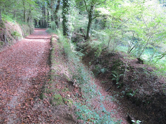 Lanvellec, Milin ar Run : ancien moulin à eau, chemin d'accès longeant le bief (non alimenté et envahi par la végétation)Immatriculation