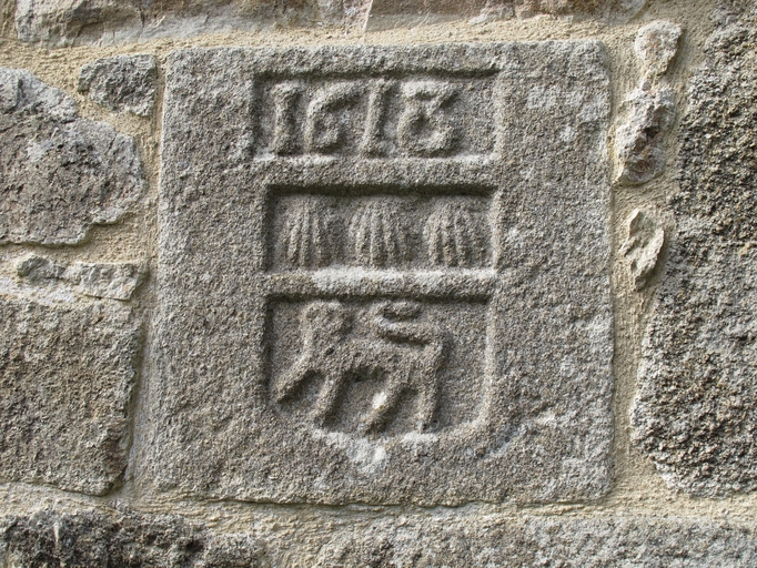 Lanvellec, Milin ar Run : ancien moulin à eau, façade antérieure orientée est, détail du logis, pierre sculptée et datée 1613Immatriculation
