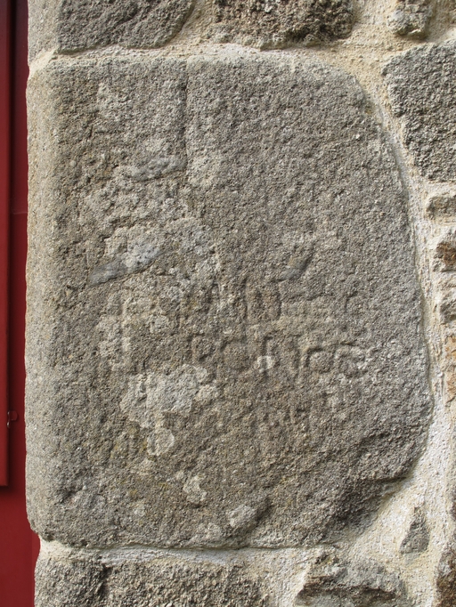 Lanvellec, Milin ar Run : ancien moulin à eau, façade antérieure orientée est, détail du logis, pierre sculptée (illisible)Immatriculation