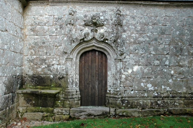 Lanvellec, Saint-Maudez : chapelle latérale au sud, porte à voussures avec arc en accolade soutenant des fleurons en croix et pinaclesImmatriculation