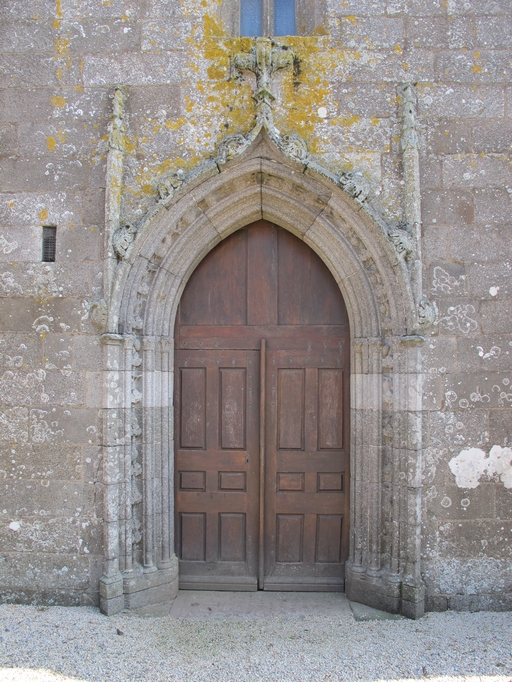 Porte ouest en arc brisé orné du répertoire gothique (porte à voussures avec arc en accolade soutenant des fleurons en croix et pinacles)Immatriculation