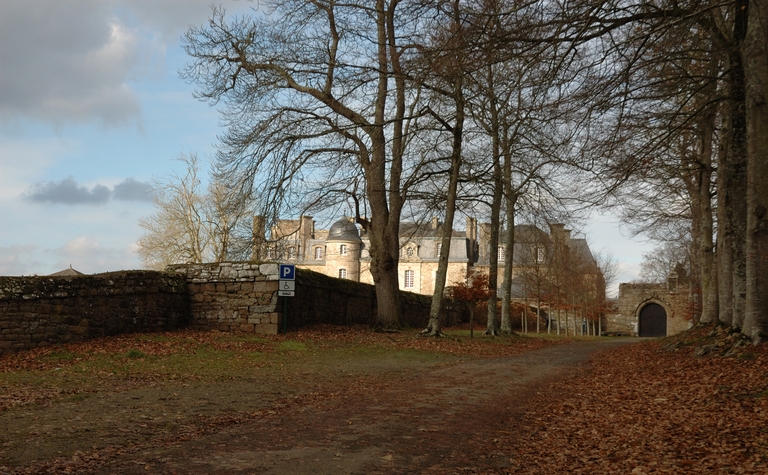 Vue de l'extrémité de l'avenue du château bordée d'arbres : mur de clôture et porte charretière surmontée d'un clochetonImmatriculation