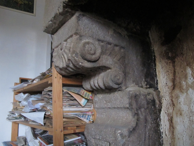Lanvellec, Goaz Ru : manoir, vue intérieure, étage, détail du piédroit et corbeau ornéImmatriculation