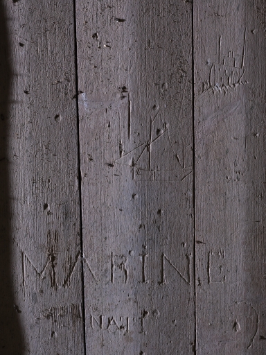 Kervéleyen, ferme, détail de graffiti sur la porte charretièreImmatriculation