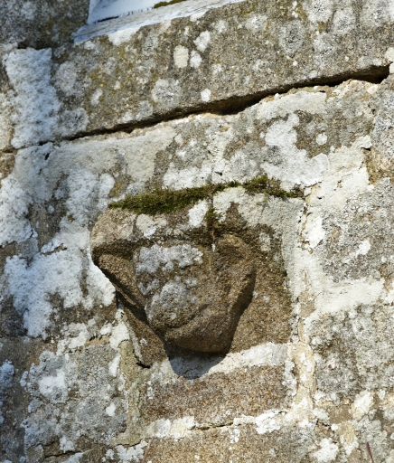 Tête sculptée en remploi dans le mur de l'écurie.Immatriculation