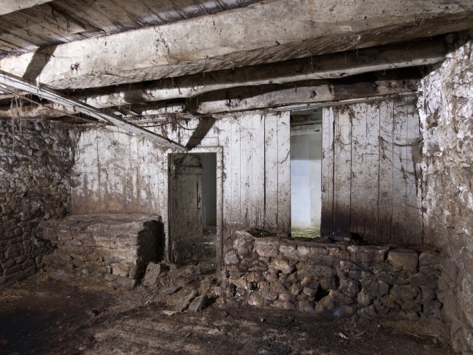 Vue intérieure de l'étable vers la salle, cloison de séparation et mangeoiresImmatriculation