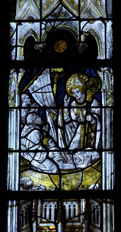Verrière à personnages de la baie 1 : Scènes des vies de saint Gilles et de saint Nicolas, église Saint-Gilles (Malestroit),