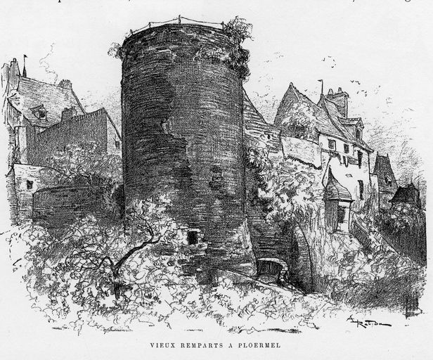 ' Vieux remparts à Ploërmel ' : vue générale d'une tour d'angle (gravure, 1891)Immatriculation