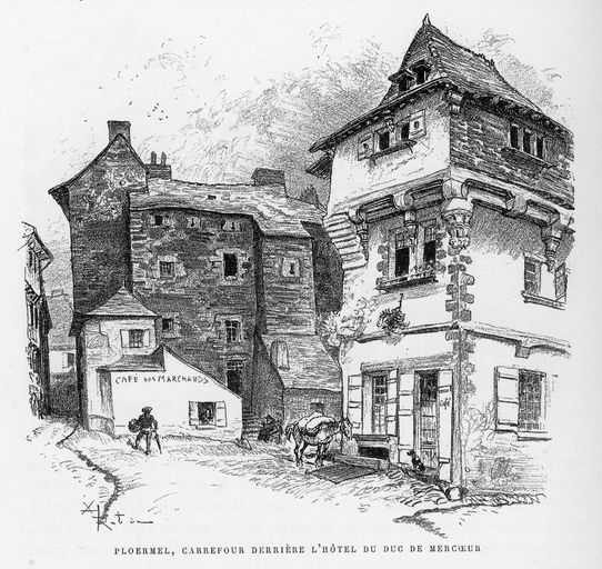 ' Ploërmel, carrefour derrière l'Hôtel du Duc de Mercoeur ' : élévation ouest de la maison (gravure, 1891)Immatriculation