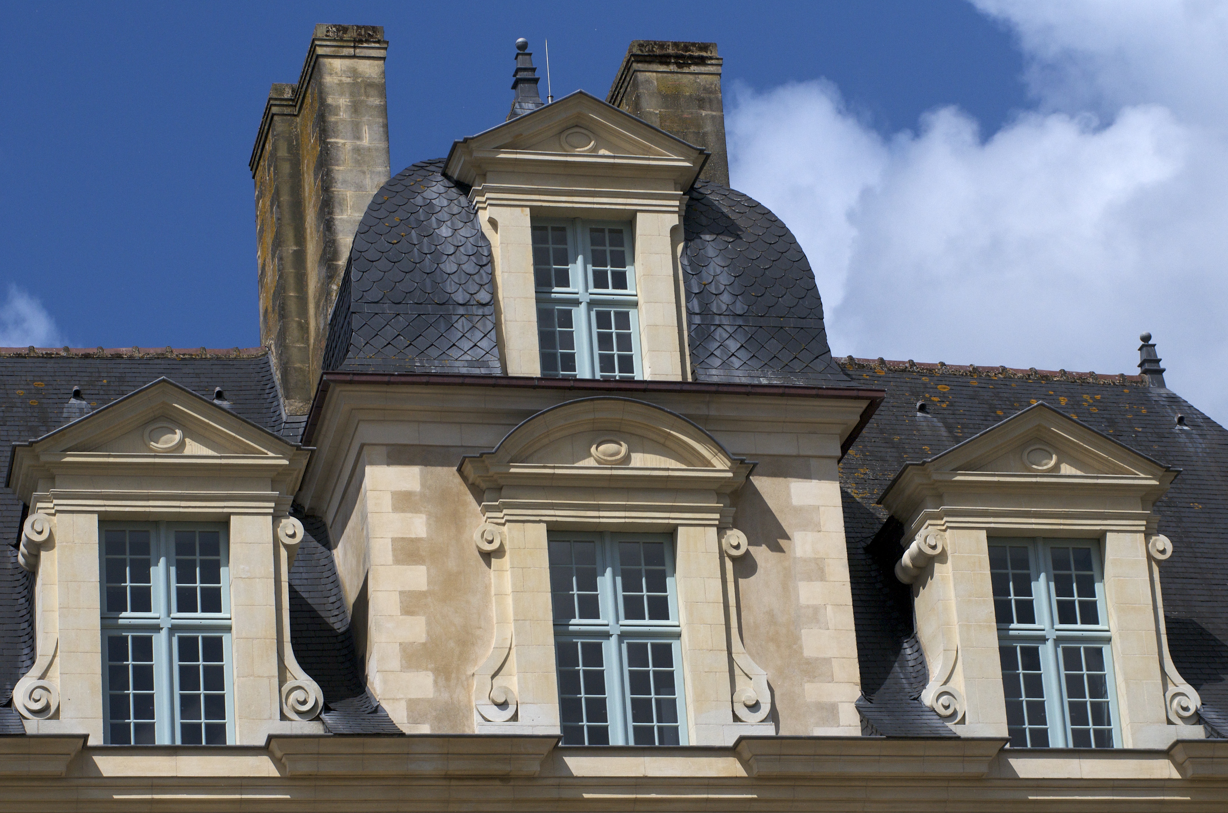 Façade principale, travées centrales, couronnement en forme de pavillonImmatriculation