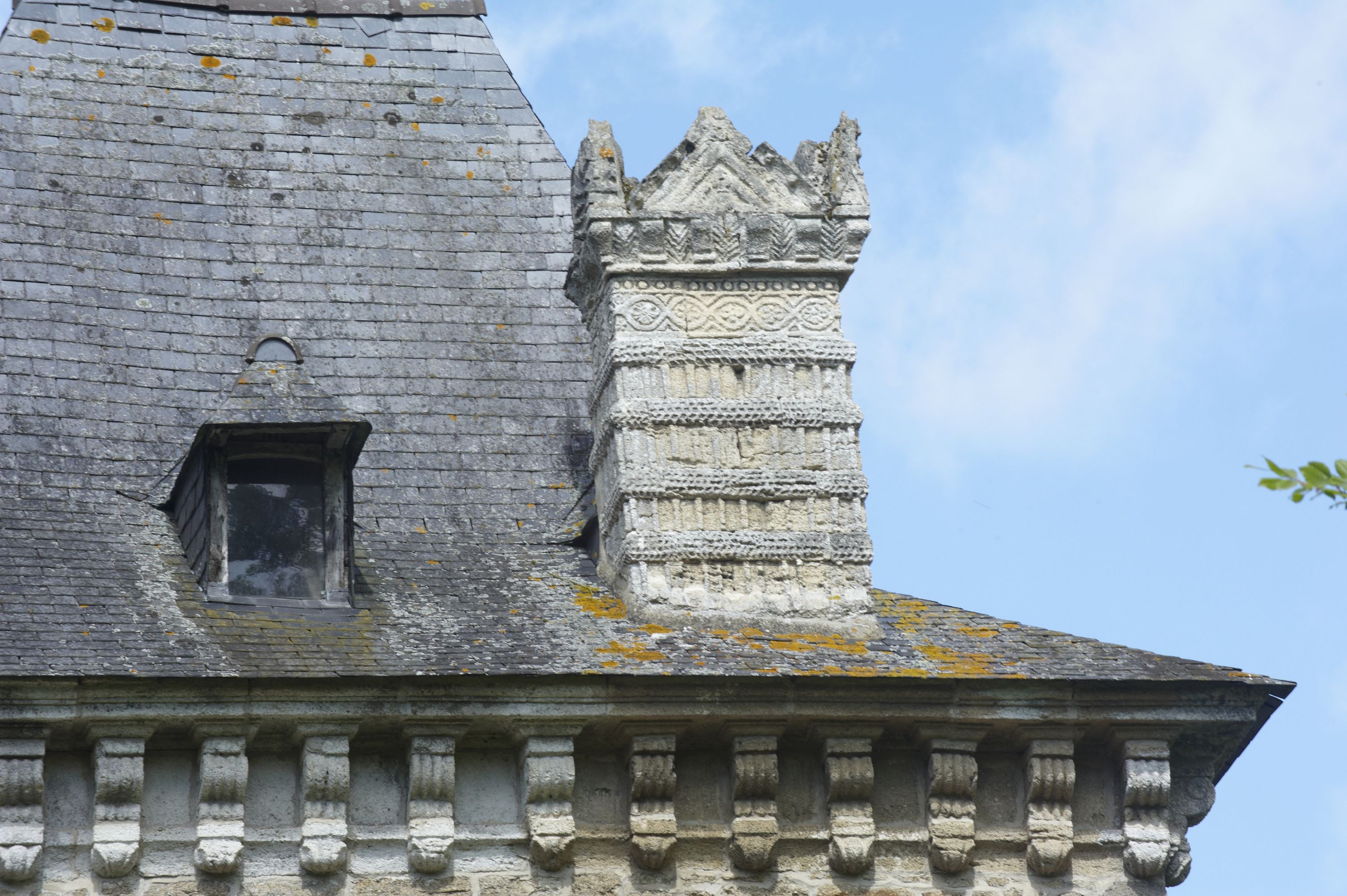 Détail : souche de cheminée, bandeaux piquetés, ruban entrelacé avec fleurs et décor de feuilles entre les consolesImmatriculation