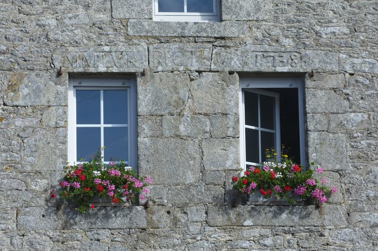 Aile arrière du logis, fenêtres de l'étage avec linteaux sculptés portant la date et le nom du commanditaireImmatriculation