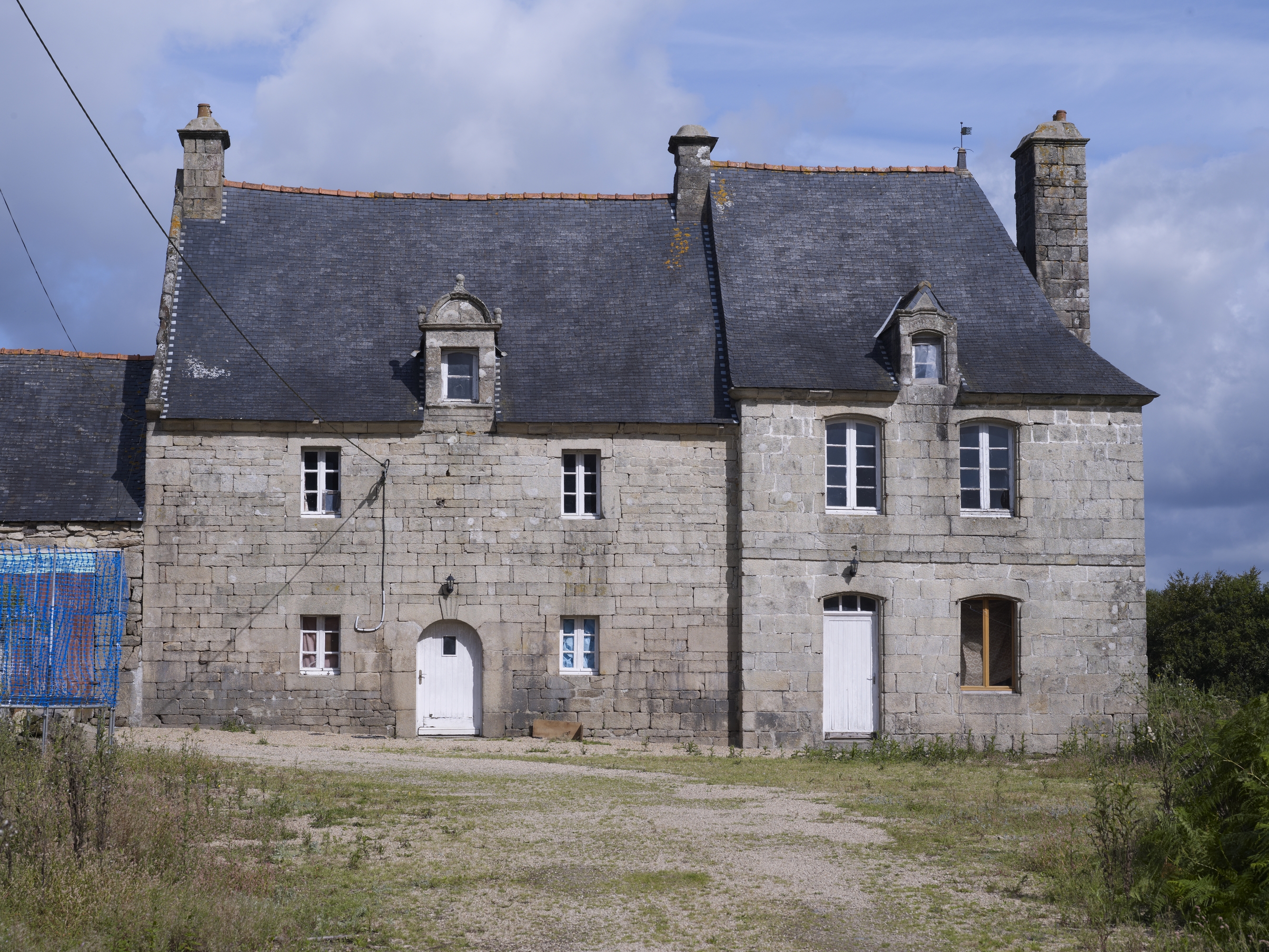 Plougras, Menez Riou : manoir, élévation antérieure orientée vers le sud-est. Si la partie gauche (centrale) porte la date de 1675, celle de droite porte la date de 1763. Une dépendance a été construite à l'ouest dans le prolongement du manoirImmatriculation