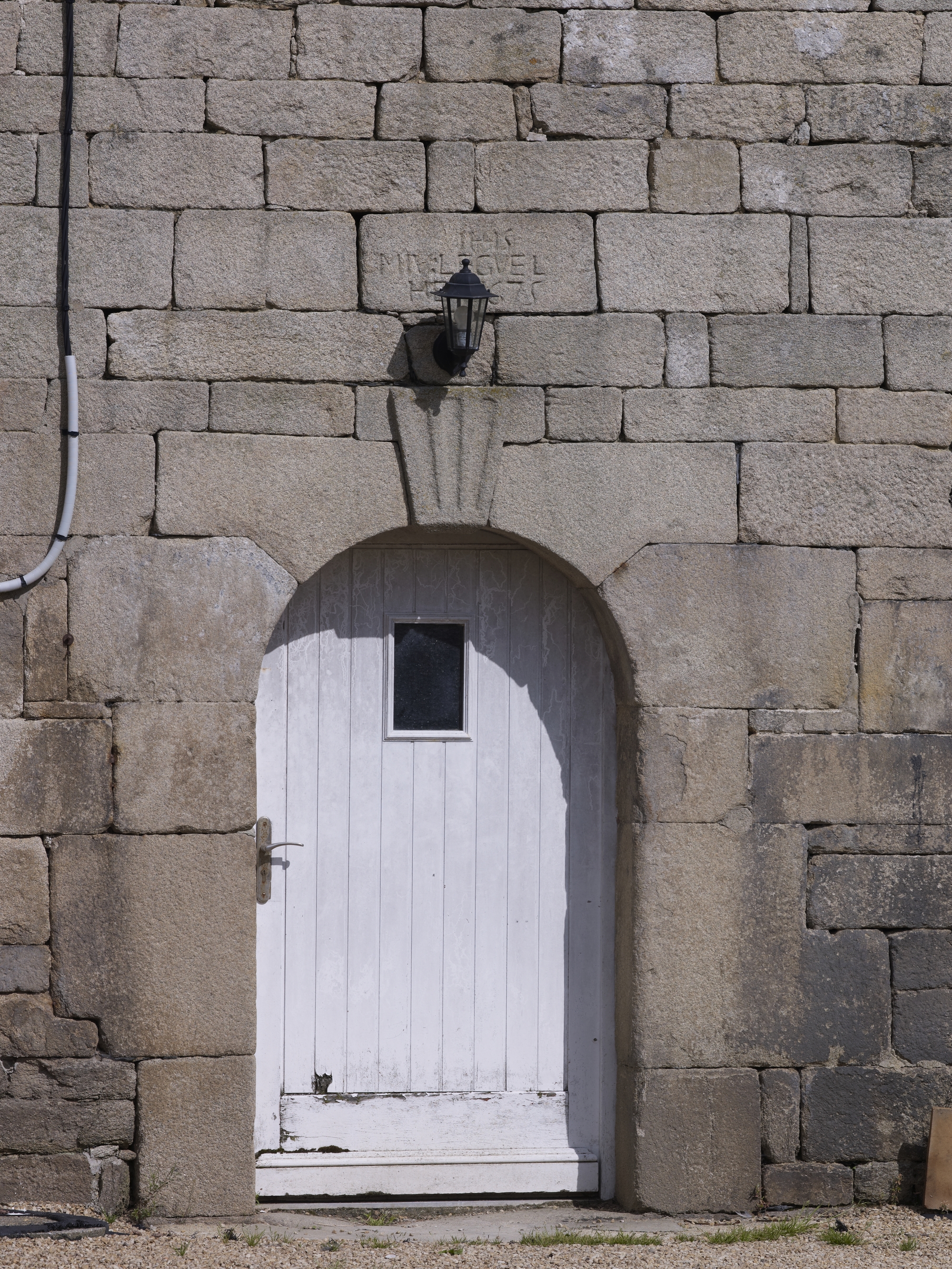 Plougras, Menez Riou : manoir. Porte millésimée de la partie gauche portant l'inscription : MIV/ LEGVEL ; HET. 1675 ; HIS.Immatriculation